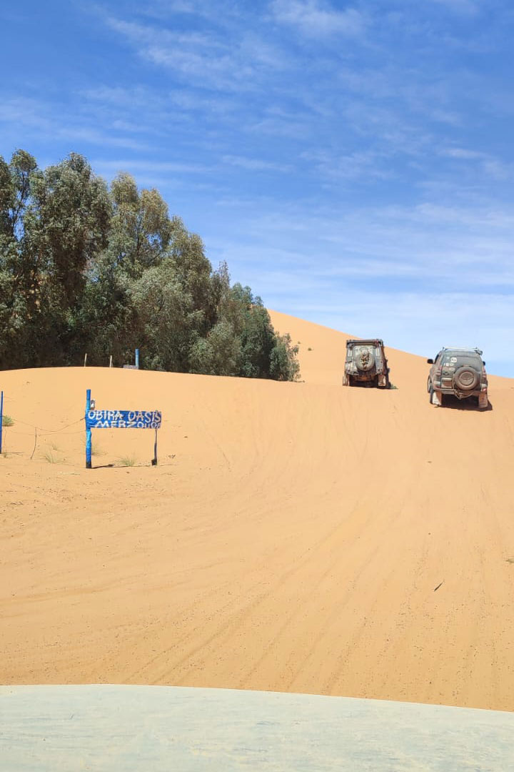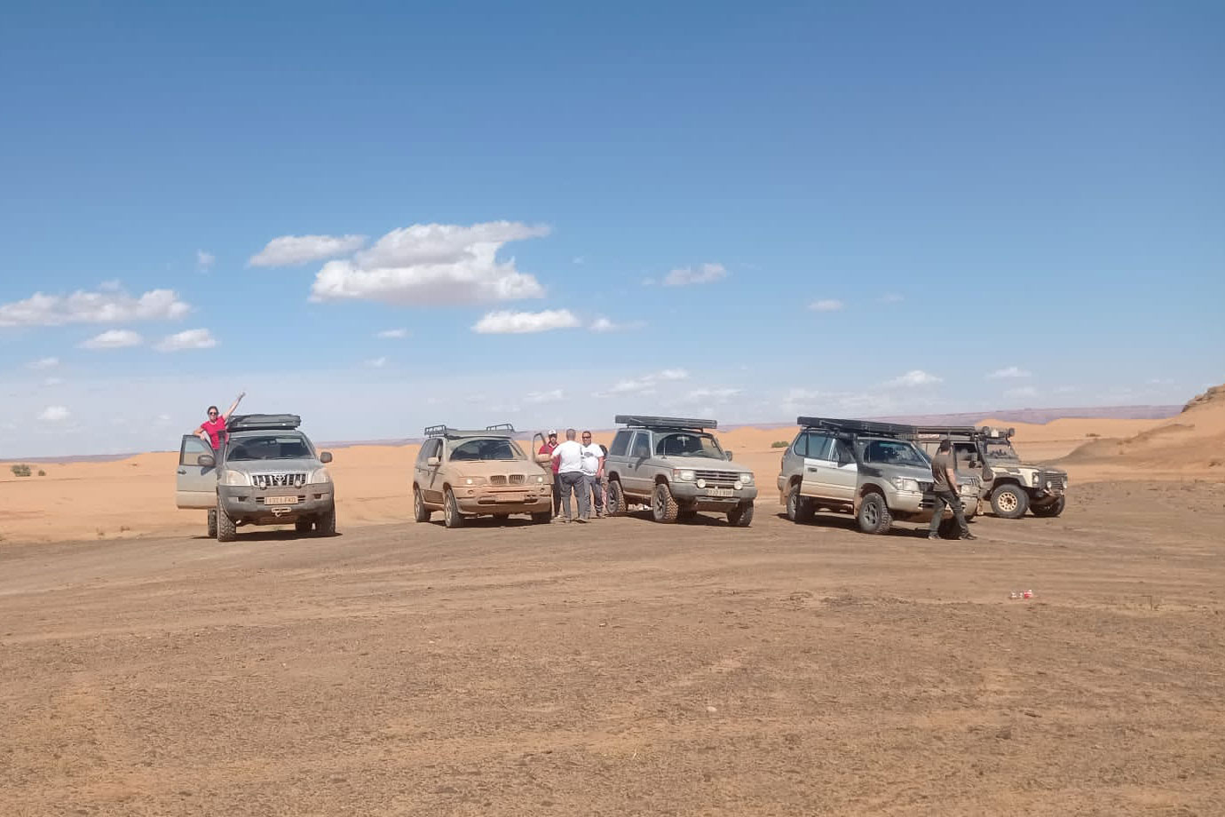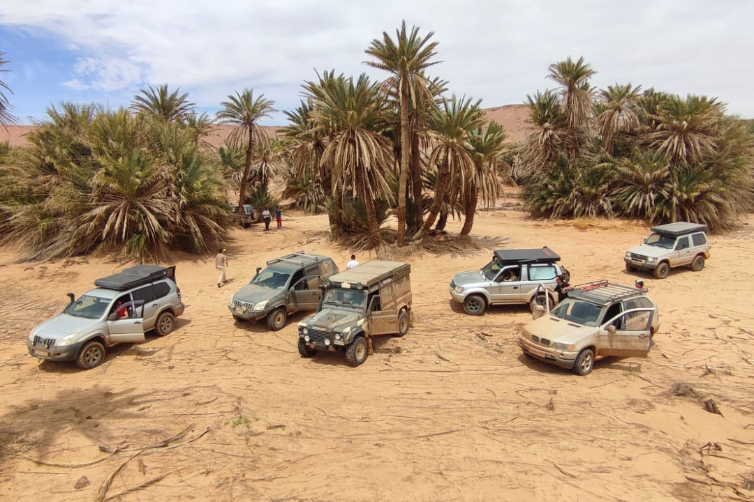 Hoy dedicaremos el día a rodear el Erg Chebbi siguiendo el río de arena y practicando conducción sobre dunas. Realizaremos un curso práctico de conducción en arena, visitaremos el Oasis de Oubira, las antiguas minas francesas y la avenida comercial de Merzouga, donde podremos hacer algunas compras. Por la tarde regresaremos al Hotel Riad Dar Hassan para cenar y descansar. Los vehículos quedarán revisados y con las presiones de neumáticos adecuadas para el día siguiente.