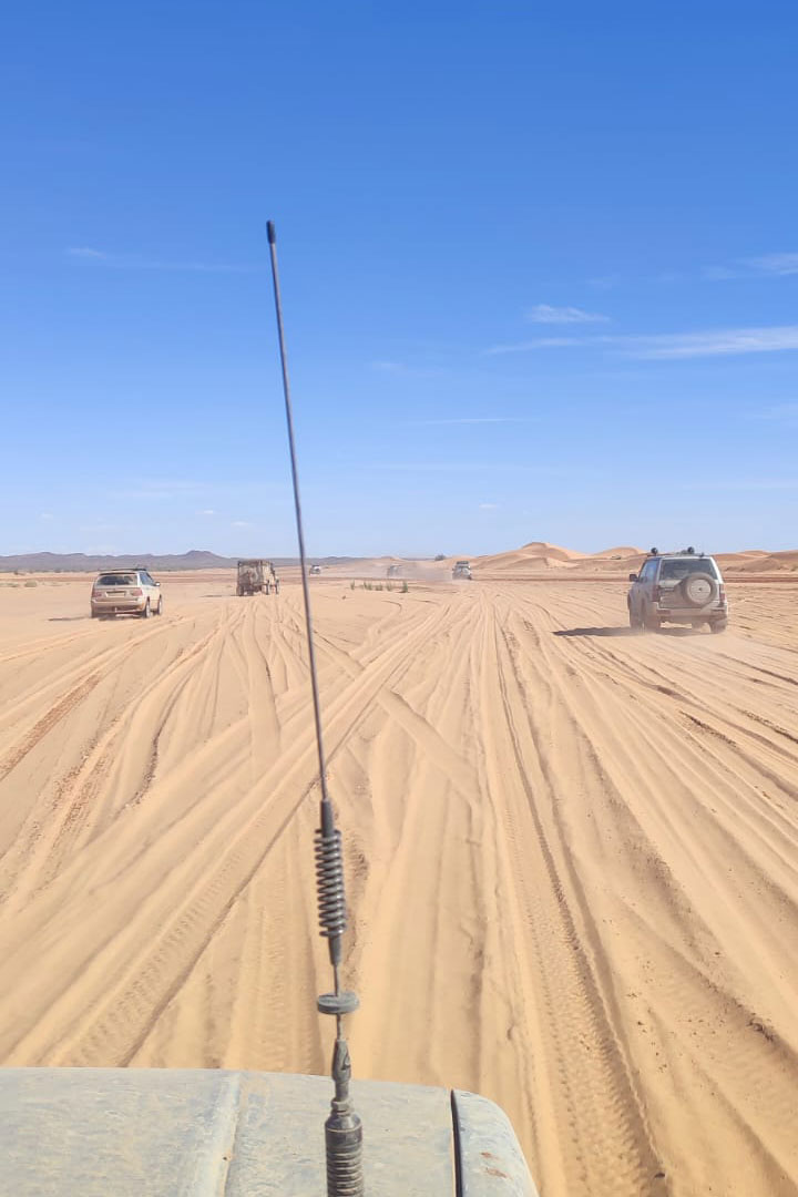 ¡Empieza el Rock and Roll! Tras desayunar y recoger el campamento nos dispondremos a ajustar las presiones de los neumáticos para adaptarlas al rodaje por pista, amarraremos todo el equipo al 4×4 para no tener ningún percance y pondremos rumbo Este para alcanzar el Lago Iriki. Realizaremos un alto en el camino en el bar-restaurante El Titanic y podremos contemplar la extensa planicie donde encontraremos el famoso té moruno para, seguidamente, continuar con nuestro Track rumbo Este hasta llegar a M-Hammid y buscar una buena zona en la que montar nuestro campamento en mitad del desierto y cotemplar el maravilloso espectáculo que supone observar las estrellas en medio del desierto.