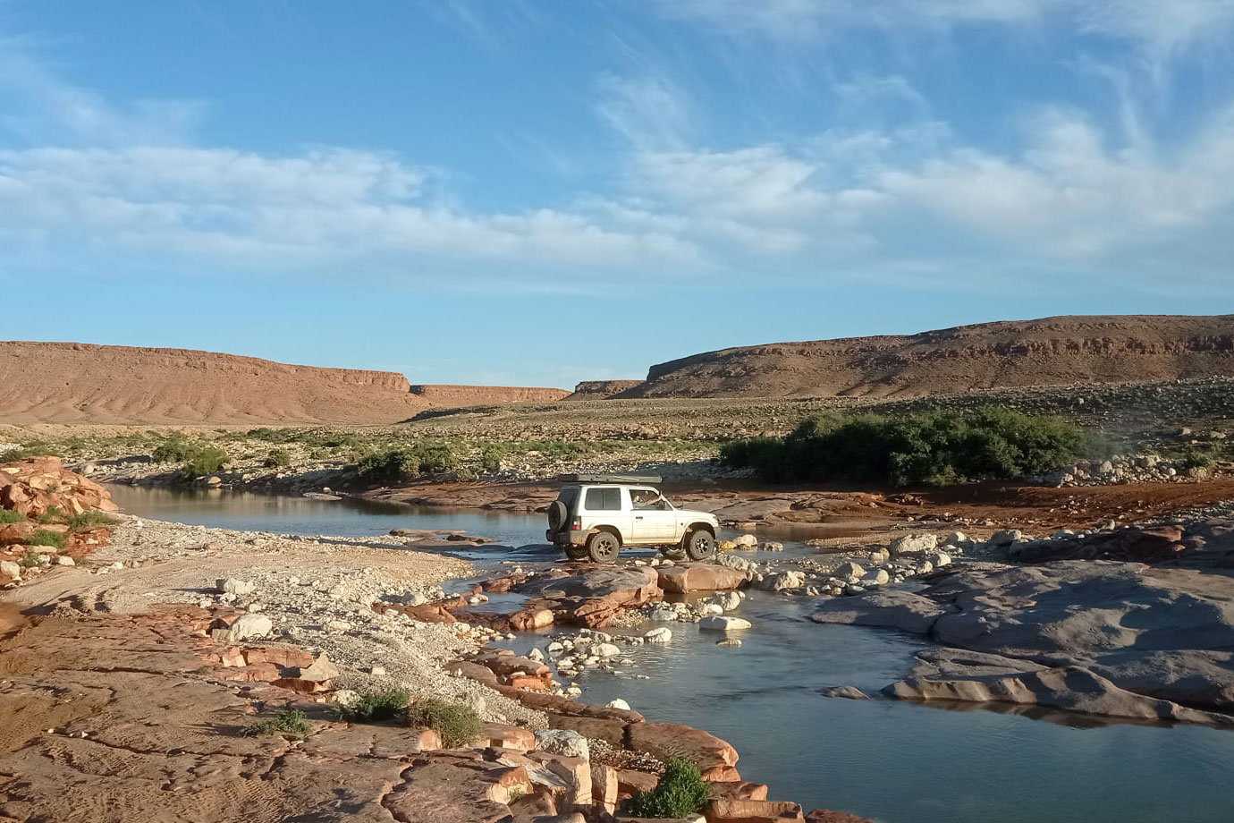 Lo primero que haremos en esta quinta jornada, una vez hayamos desayunado, será controlar el combustible de nuestros 4×4 y repostar, en caso de que sea necesario, en la única gasolinera que existe en este tramo que se encuentra en Tagounite, único lugar en el que podremos adquirir víveres como agua y pan para el día. Retomaremos nuestro Track y seguiremos con rumbo Este. Hoy realizaremos un ejercicio de navegación que consistirá en el paso por tres waypoints de paso obligatorio. Estos waypoints estarán situados en el Monumento Mohamed Gordito, Lago Maider y Ciudad perdida, que se encontrarán repartidos a lo largo de nuestro Track diario. Pasaremos por pistas rápidas de tierra, piedra y arena. Se trata de una larga etapa de off road tras la que llegaremos tarde a nuestro destino en el Hotel Riad Dar Hassan donde nos estarán, como siempre, esperando para entregarnos las habitaciones y cenar.