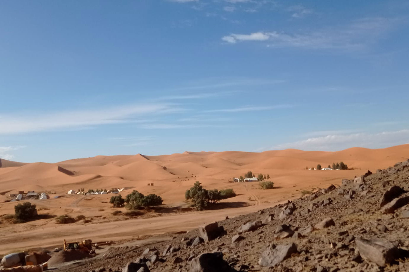 Al amanecer disfrutaremos de las impresionantes vistas desde el hotel, situado a los pies de las famosas Dunas de Merzouga (Erg Chebbi).